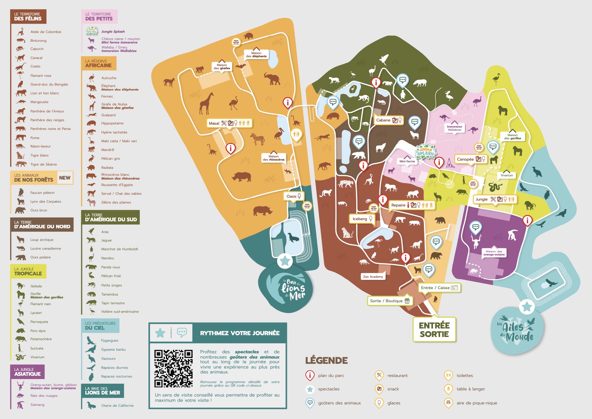 Les différentes zones animalières du parc : Gorilla’s Camps, La plaine africaine, La baie des lions de mer, Amazone Jungle, La petite ferme dans la forêt, Peruvia bay, Le vivarium tropical, Orang-Utan Jungle, Les prédateurs du ciel